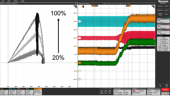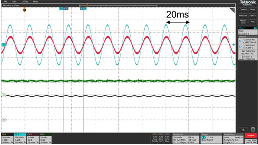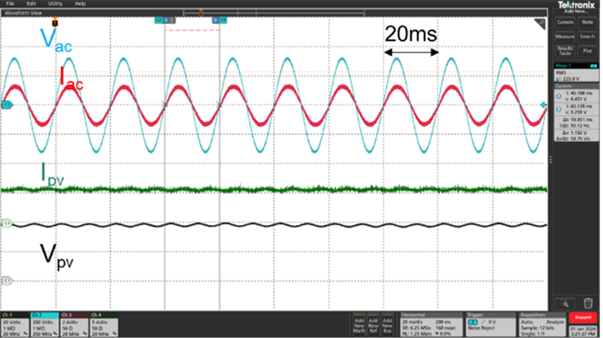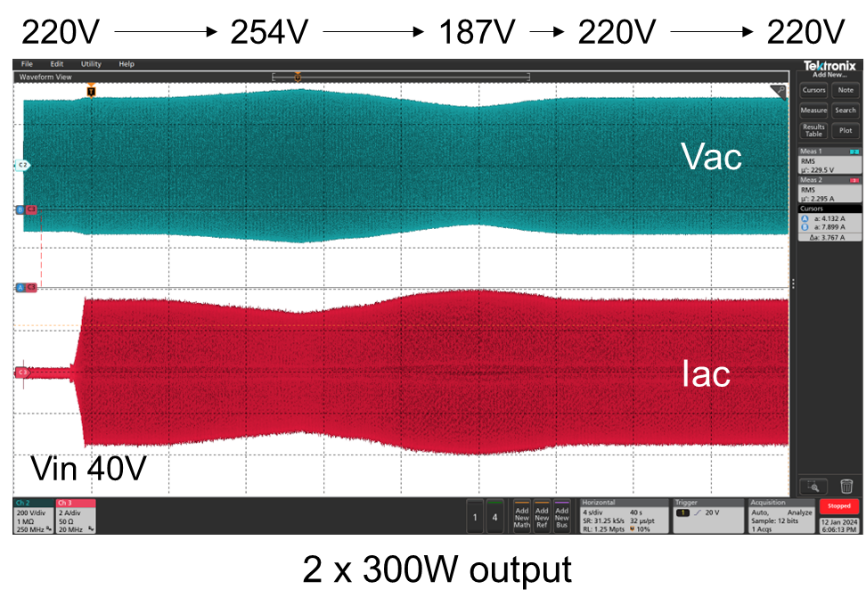 下圖是微型逆變器工作在187 – 254V電網電壓下2 x 300W功率輸出的波形,微型逆變器可以在不同的電網電壓下進行可靠工作。