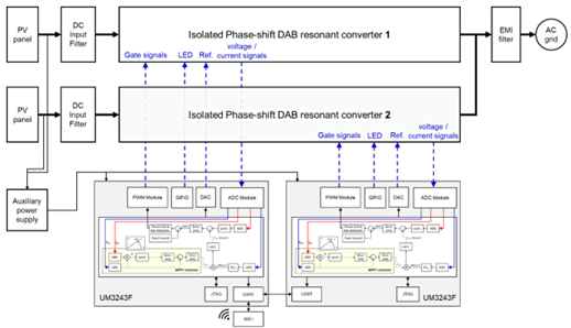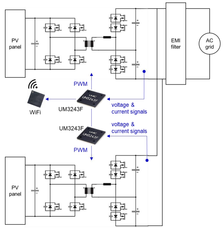 在光伏微型逆變器控制模塊中,主要組成部分包括廣芯微自研主控高性能數字電源MCU UM3243F、功率半導體、無源元件和柵極驅動電路等。通過獨立UM3243F控制,實現兩路光伏電流輸入,一路交流電流輸出的2-in-1光伏微型逆變器方案。UM3243F以其高性能指標與數字電源控制算法,可以完全取代以往基于DSP的實現方案。