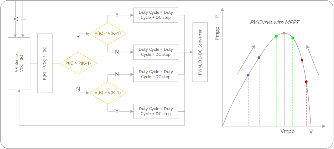 擾動觀察法從最開始的狀態開始,每一次都對輸入的信號進行調整,不斷增加或減少輸入信號的值,然后通過判斷下一次的輸出的變化方向,結合輸入的變化方向,得出此時運行的狀態,從而判斷出下一次改變輸入的方向,然后不斷循環,最終擾動到最大功率點附近。