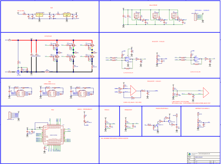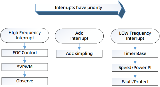 電機(jī)控制部分主要在高頻中斷中執(zhí)行運(yùn)算,主要處理FOC運(yùn)算部分,及位置速度觀測器。ADC中斷主要處理采樣數(shù)據(jù),低頻中斷主要處理速度/功率外環(huán)控制部分及故障檢測部分。