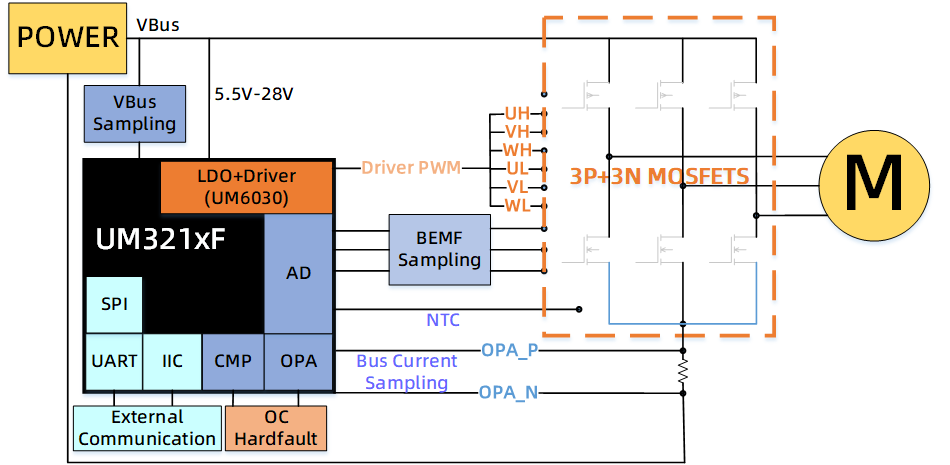 1.內置5V LDO Power電源直接輸出至MCU(支持5.5-24V寬電壓輸入);3.內置3路比較器快速直接獲取反電勢信號或硬件過流保護 ;4.PWM支持與比較器的聯動,異常情況緊急停機保護機制,有效防止功率元器件損壞;6.豐富的外設接口(SPI/UART/IIC/CAN),支持多傳感器擴展功能;7.板極ESD設計可靠度可達8KV以上,得益于廣芯微UM321xF芯片優異的ESD性能;8.高集成度、高可靠性、低功耗MCU,電機控制相關外圍器件只有40個左右,大大降低設計及生產成本,降低器件失效不良率。