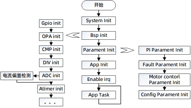 控制器上電后進入系統配置,依次進行IO端口配置,AD轉換模塊配置,定時器的配置,中斷初始化,定時器初始化,保護參數初始化,交互參數初始化,初始化狀態檢測,使能中斷,最后進入主循環(App-Task)執行相應app層事件。電機控制部分主要在高頻中斷中執行運算,主要處理FOC運算部分,及位置速度觀測器。ADC中斷主要處理采樣數據,低頻中斷主要處理速度/功率外環控制部分及故障檢測部分。