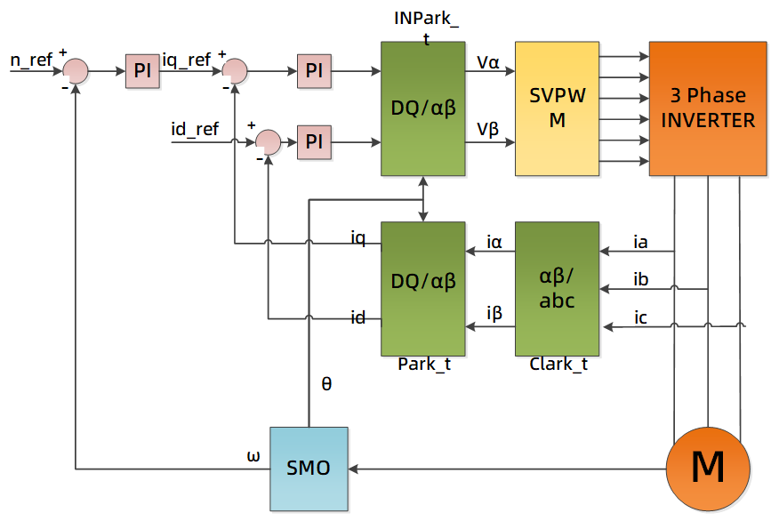 電機控制算法采用單電阻無感FOC的電流轉速雙閉環控制系統: