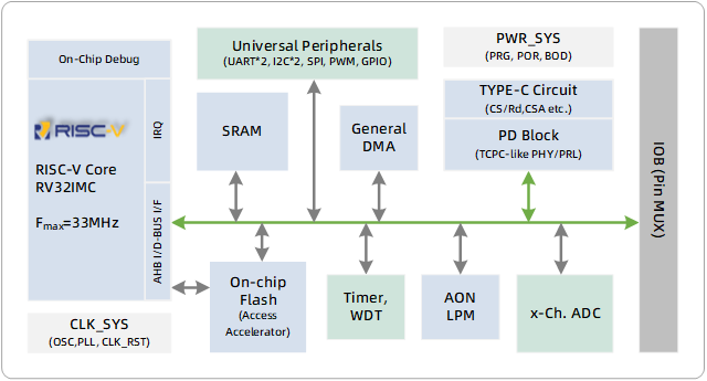 本次展會展示的數字電源專用芯片包括PD Plus控制器UM350系列和高性能主控處理器UM324xF系列,PD Plus控制器UM3506內部采用TCPM/TCPC的分層架構來實現完成的PD/TYPE-C系統功能。它集成了原生的TCPC-like的模擬前端,32位創新型的RISC-V指令集內核,片上的大容量Flash/SRAM,增強型外設及完備的系統資源。客戶可以在一個差異化的PD Plus系統中,靈活地管理電源策略和定制化地擴展控制及交互等功能。