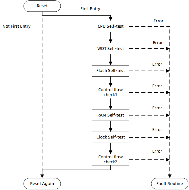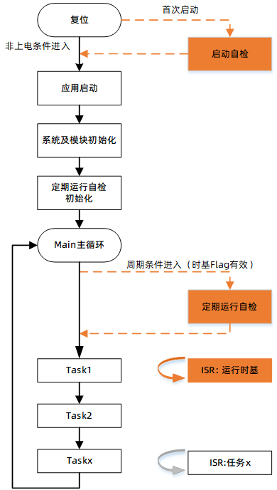 啟動時自檢項:CPU寄存器自檢、程序計數器PC自檢、看門狗自檢、Flash內容完整性校驗、RAM自檢、系統時鐘和中斷自檢,以及針對完整測試過程的流程控制與監測。