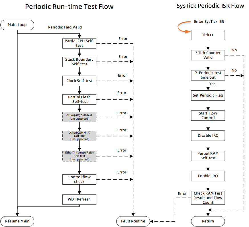 運行時自檢項:CPU部分寄存器自檢、Flash分塊自檢、RAM分塊自檢、棧上溢/下溢檢測,系統時鐘和中斷自檢。部分檢測功能可通過修改宏定義值進行開關和配置。