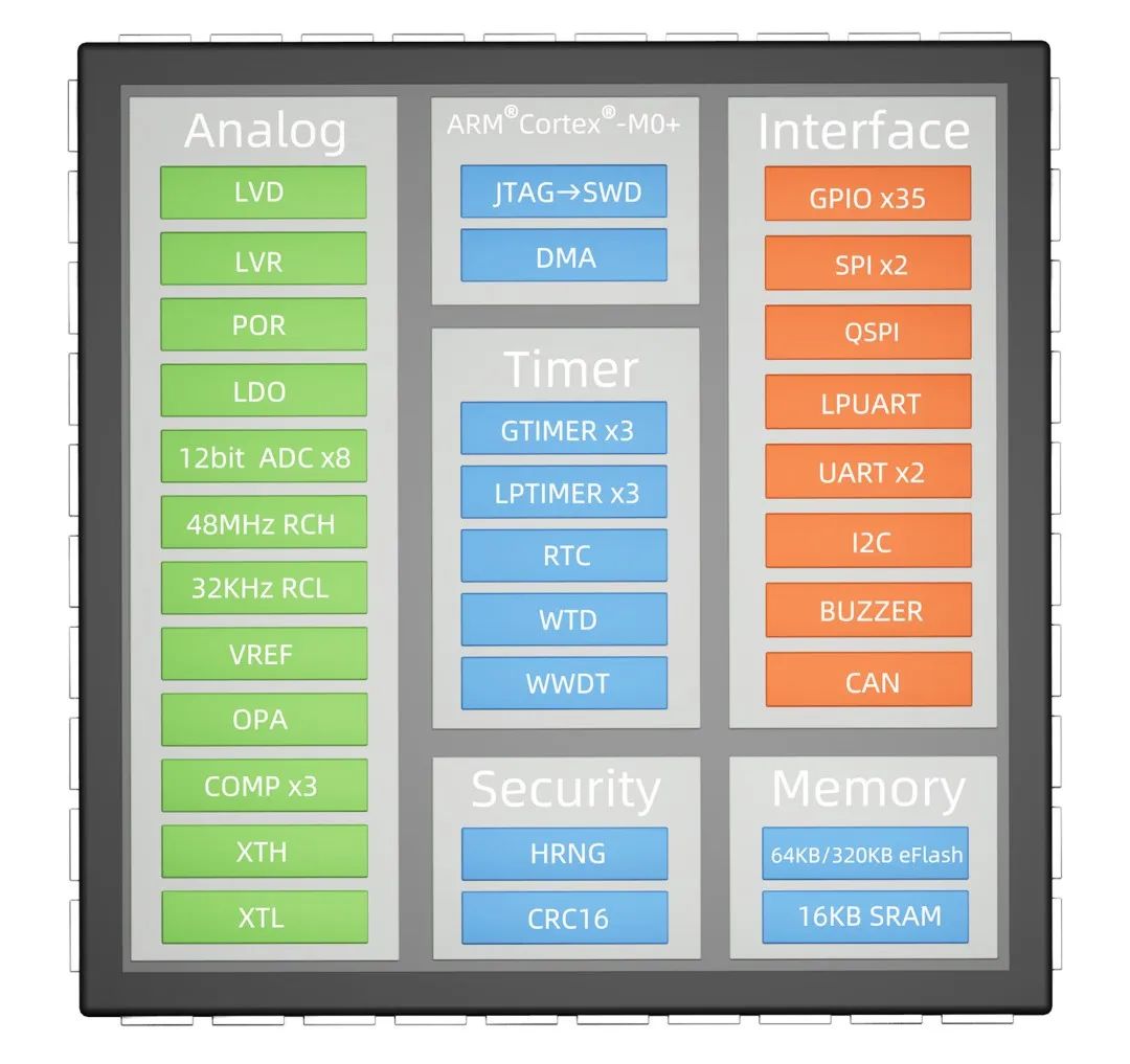 UM321xA系列芯片是廣芯微電子(廣州)股份有限公司研制的基于ARM Cortex-M0+內核的超低功耗、Low Pin Count、寬電壓工作范圍的32位IoTP處理器SoC芯片系列,重點面向物聯網行業便攜式傳感測量系統中的電池應用場景。依據行業應用場景的具體應用需求,芯片系統采用了獨特的低功耗設計技術,內部集成了CAN、12位SAR ADC、UART、SPI、QSPI、I2C等通用外圍通訊接口,ADC、OPA、比較器等傳感獲取接口,以及LPUART、LPTIMER、WDT等超低功耗模塊接口。具有高整合度、高抗干擾、高可靠性和超低功耗等技術特點。內置RC高頻和低頻振蕩器,支持免晶振應用。支持Keil MDK集成開發環境,支持C語言和匯編語言進行軟件開發。