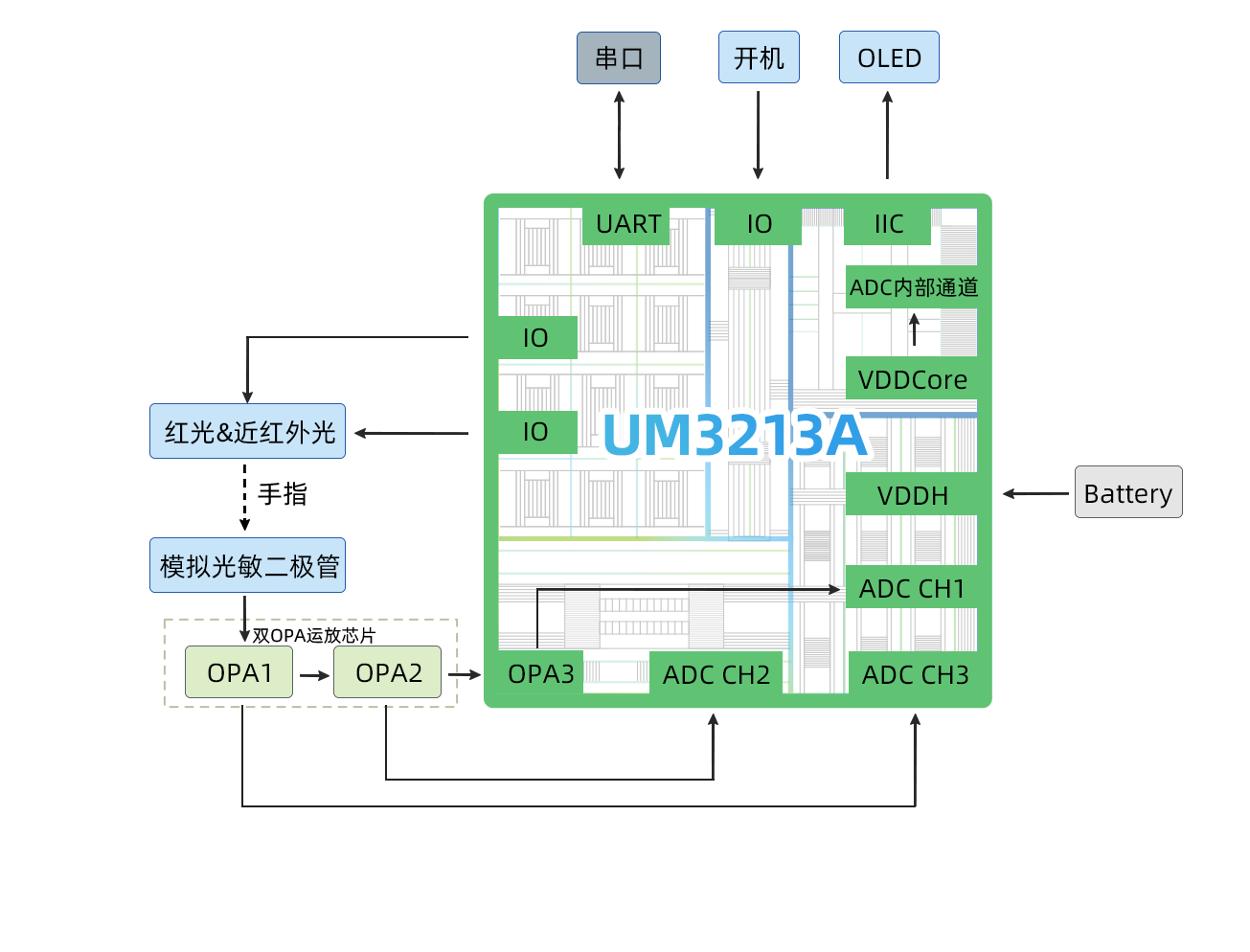 本方案基于UM3213A芯片,主頻32MHz,內置64KB閃存,提供最大35個GPIO,內部集成有一路OPA和8通道1Msps ADC,大大簡化外圍電路設計,此外低至0.48uA超低功耗能夠大大延長脈搏血氧儀的使用時長。