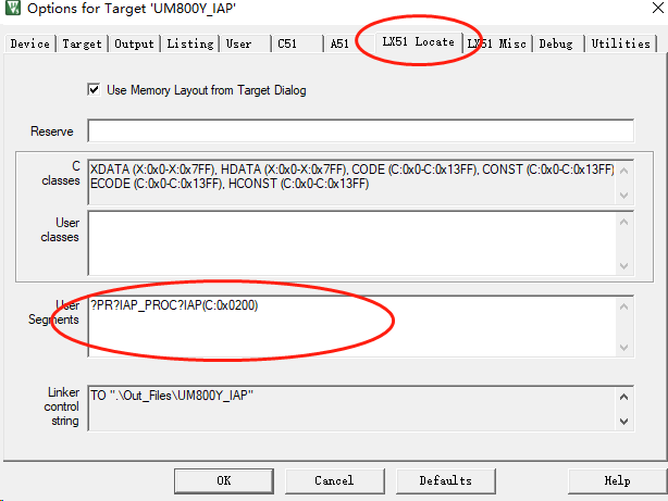 (2)設置IAP_Proc函數(IAP更新處理程序)的入口地址,用絕對地址定位的方法設置在某個固定的地址,下面以設置地址為0x0200為例。點開keil C51中的Options for Target,勾選下圖所示的地方。