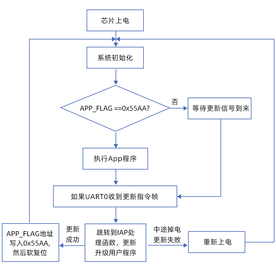 使用IAP的上位機,通過IAP程序的處理函數,即可實現應用程序的更新升級。整個IAP的實現流程如下圖所示: