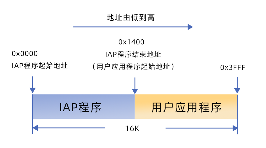 本文實驗以UM8004為例,flash大小為16K。UM8004的中斷向量表以及IAP固件程序存放到0x0000-0x1400區域,在之后的更新中不會對以該區域空間進行擦寫。用戶APP應用程序存放在從0x1400-0x3FFF的空間。每次需要更新升級時,將這段空間進行擦寫,替換成更新的應用程序代碼。