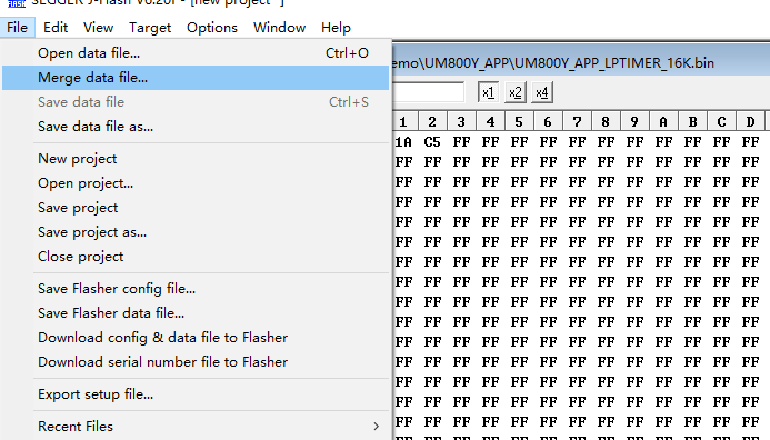 首先打開J-Flash工具。點擊open data file,打開用戶app程序的bin或者hex文件。這里選擇軟件開發包里UM800Y_APP文件夾中的Lptimer工程中的bin文件。(可通過hex2bin工具將hex轉換成bin文件)