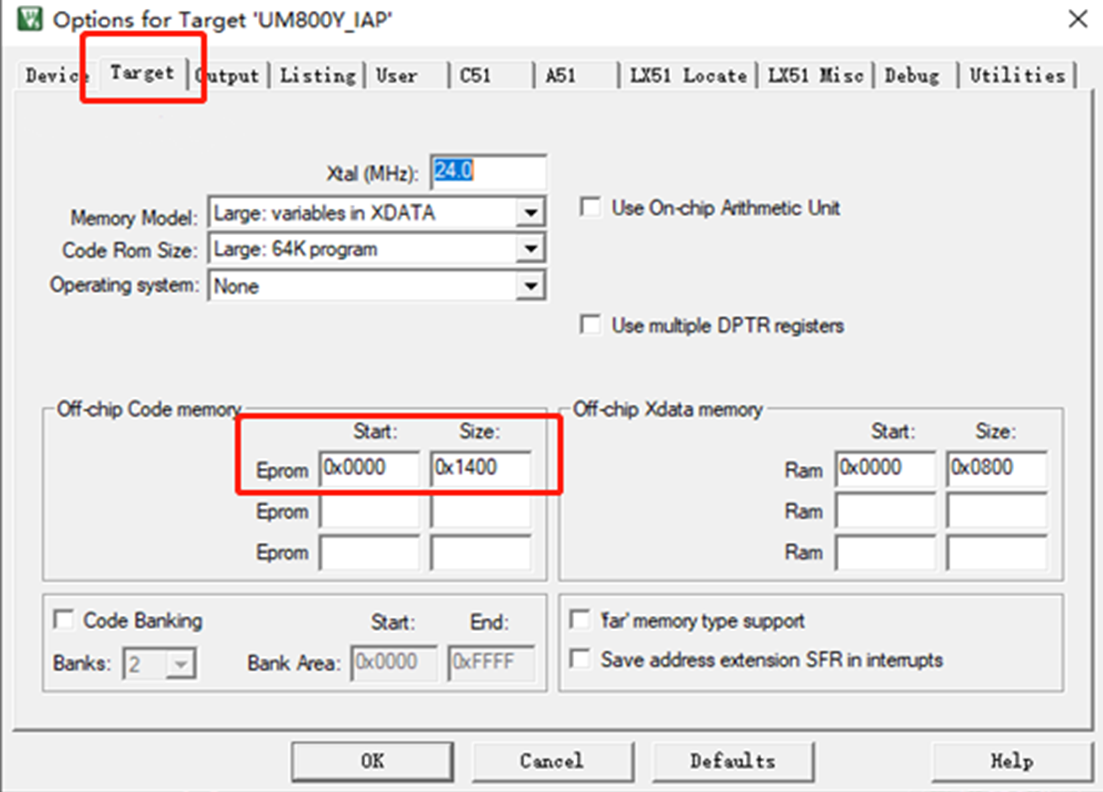 (1)需要在Target選項卡里設置用戶應用APP程序的起始地址與大小,如: