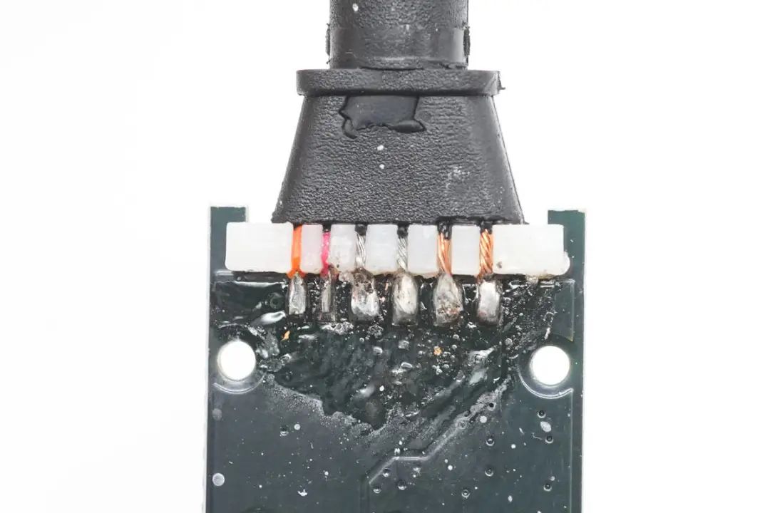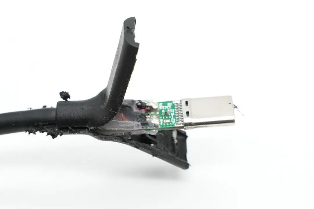 首先沿側面切開端子外殼,外殼為整體注塑,線纜焊接處通過硬膠固定。