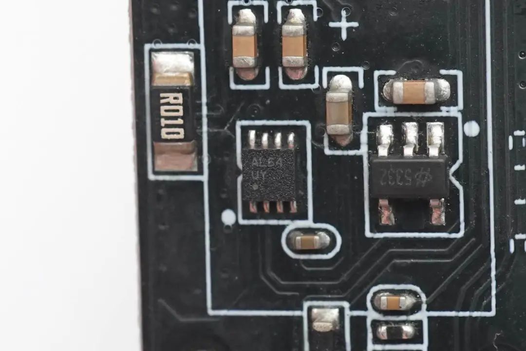 PCBA模塊背面焊接三顆芯片和電流取樣電阻,左側按鍵用于切換顯示狀態。