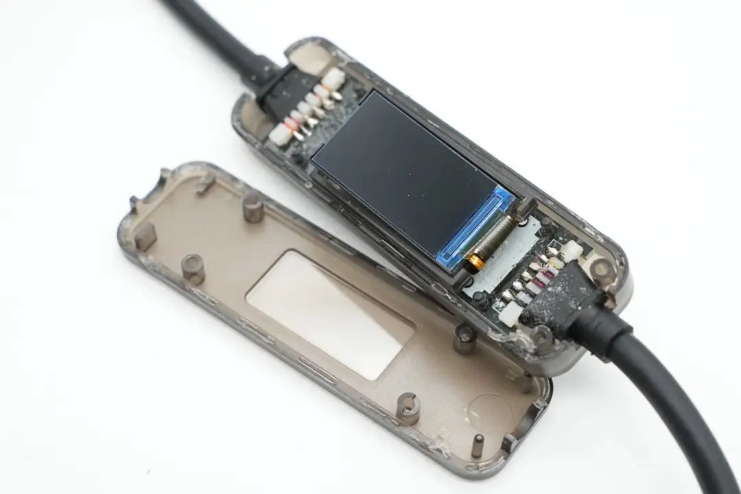 數據線使用魔術扎帶捆扎整理,不僅支持100W PD快充,而且自帶0.96英寸顯示屏幕,主體外殼還采用半透明設計,隱約可見內部PCB板和芯片,十分硬核。