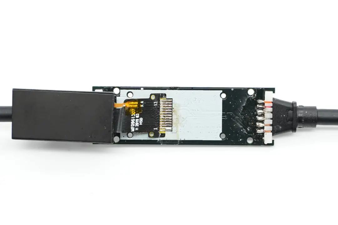 沿外殼接縫撬開外殼,數據線焊接到內部PCBA模塊上,同時還焊接液晶屏幕,液晶屏幕底部使用一塊灰色塑料支架支撐固定。