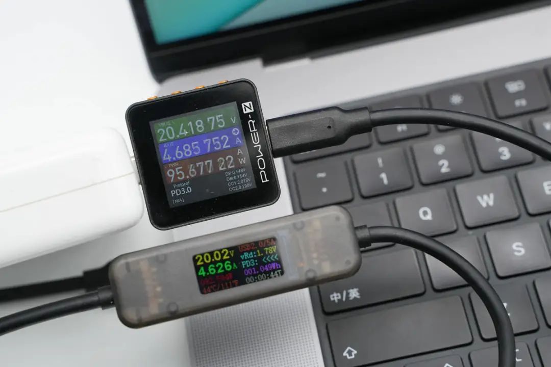 使用這根線纜搭配蘋果充電器給MacBook進行充電,不考慮線纜壓降問題情況下,ChargerLAB POWER-Z KM002C和數據線顯示屏顯示充電功率都在95W左右,表明數據線支持100W PD快充。
