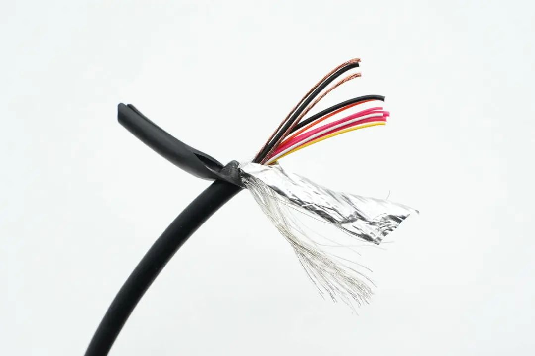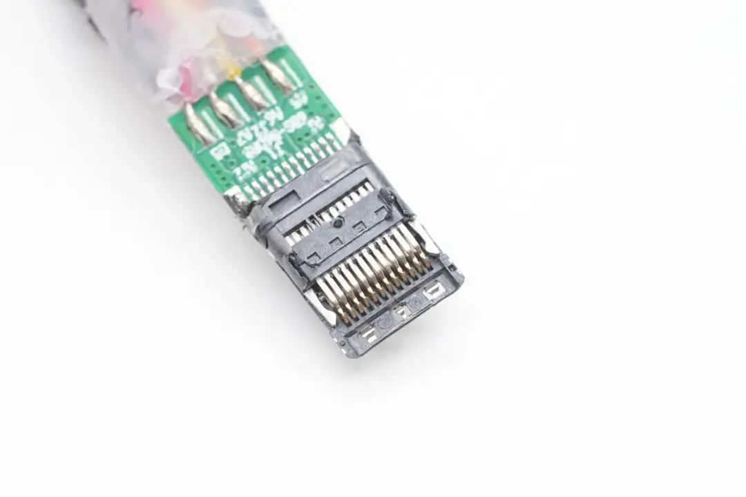 最后是線纜的拆解,線纜截斷橫截面一覽,線纜內芯外罩屏蔽層,內部8根線纜用于電力傳輸和數據傳輸。