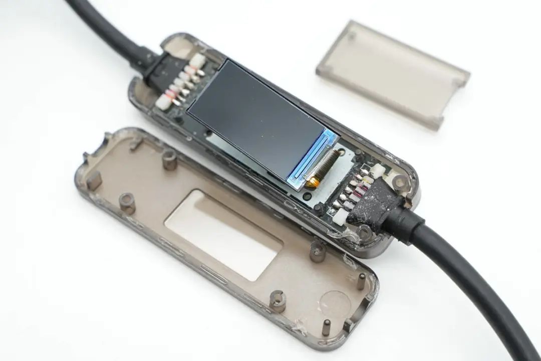 這款USB-C數據線的數顯屏幕模塊采用灰色塑料外殼,沿接縫即可拆開,大大方便了我們拆解。